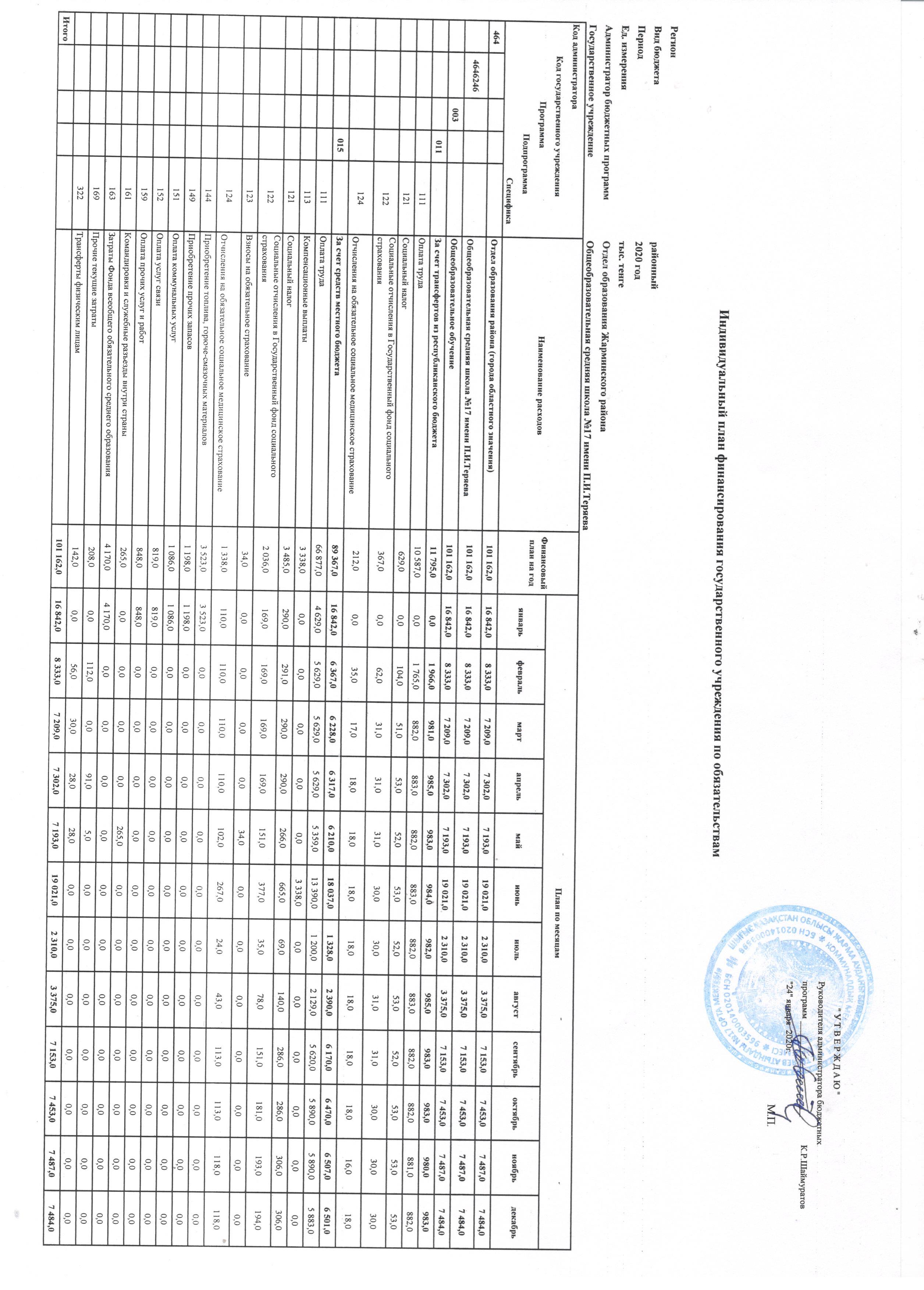 Индивидуальный план финансирования гос.учреждения по обязательствам » Абай облысы білім басқармасының Жарма ауданы білім бөлімінің "П.Теряев атындағы №17 орта мектебі" КММ