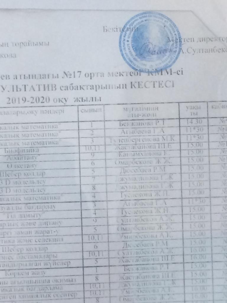 2019-2020 оқу жылындағы үйірмелер кестесі » Абай облысы білім басқармасының Жарма ауданы білім бөлімінің "П.Теряев атындағы №17 орта мектебі" КММ