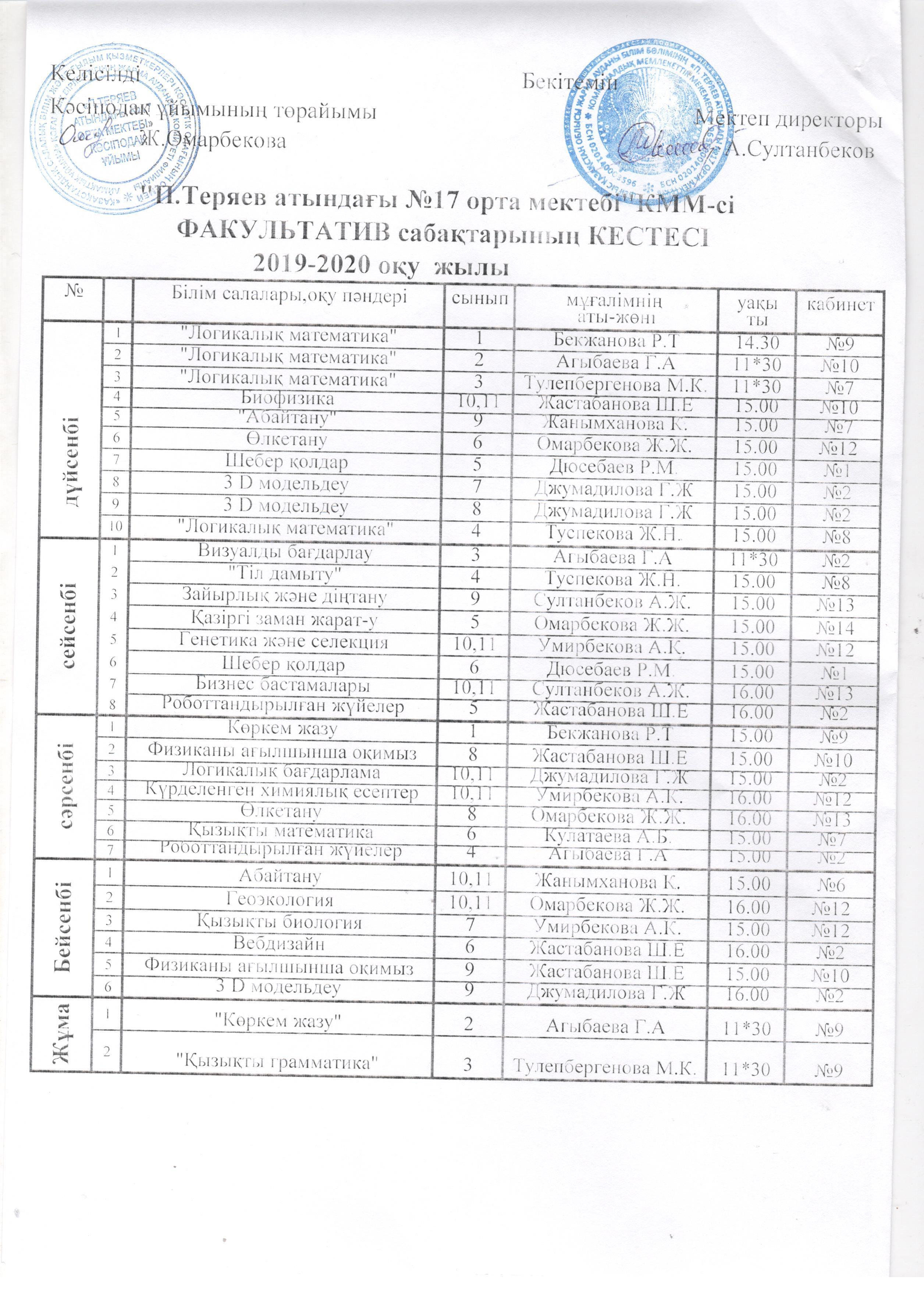 Расписание вариативных уроков на 2019-2020 учебный год » Абай облысы білім басқармасының Жарма ауданы білім бөлімінің "П.Теряев атындағы №17 орта мектебі" КММ