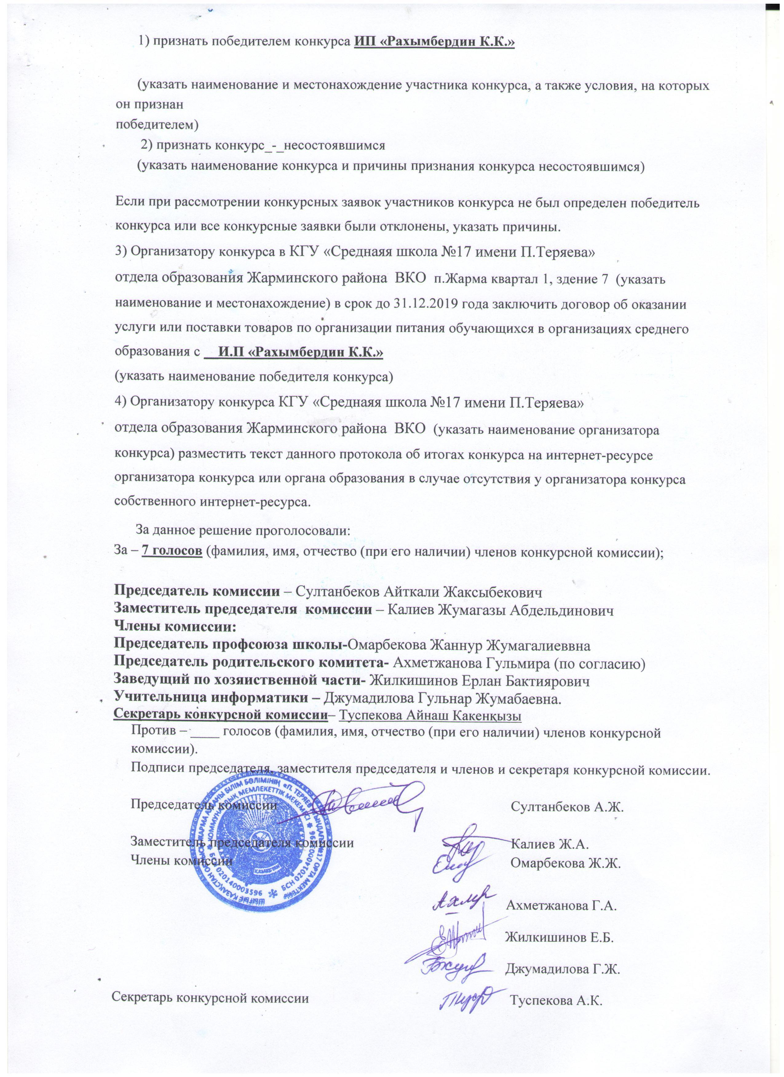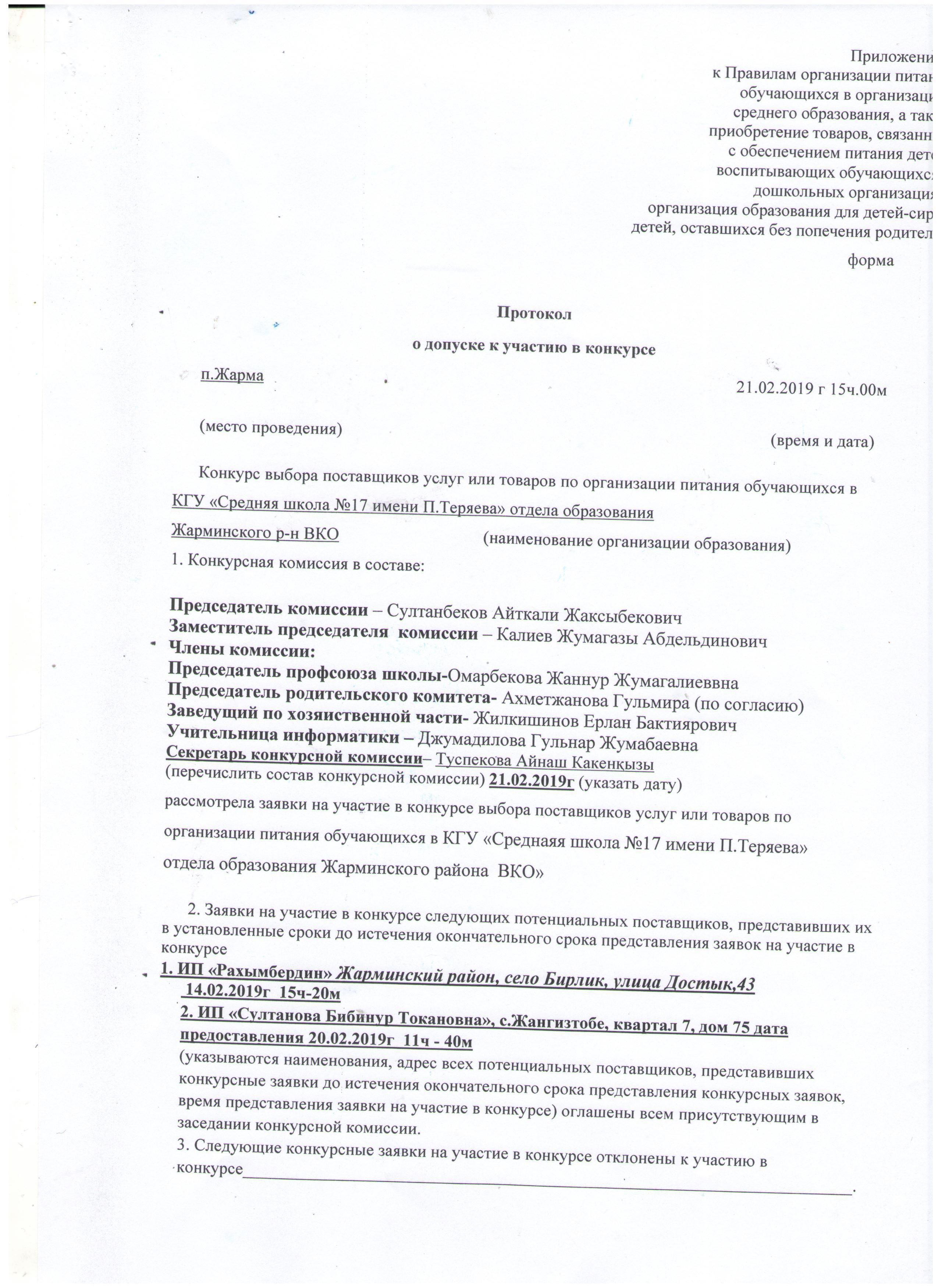 протакол конкурса » Абай облысы білім басқармасының Жарма ауданы білім бөлімінің "П.Теряев атындағы №17 орта мектебі" КММ